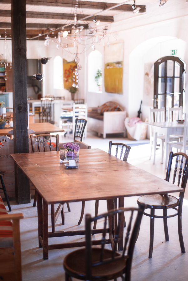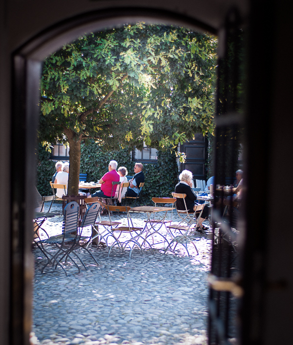 Antingen kan man sitta ute i den pittoreska innergården, inbäddad i härlig grönska och kullersten eller så sätter man sig i den förtjusande innerdelen med en lantlig atmosfär.