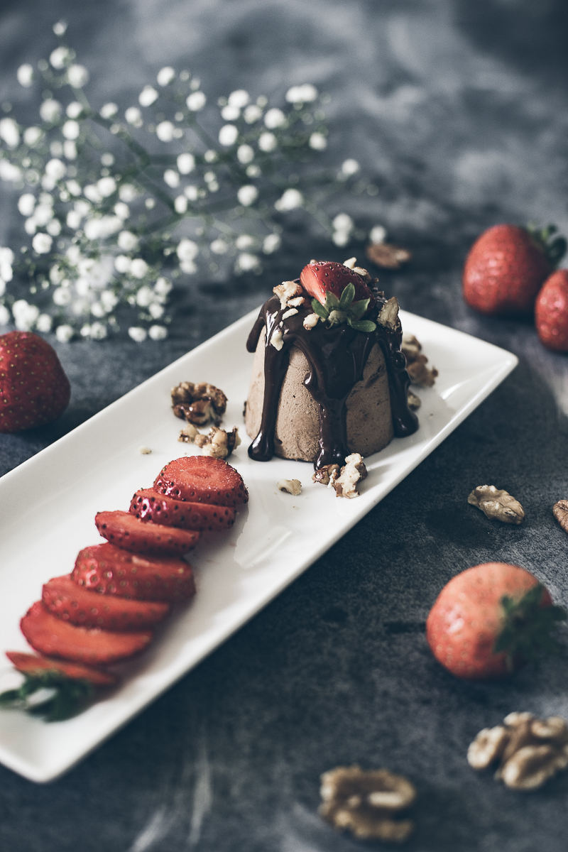 Ta fram parfaiten och dekorera med chokladsås, sötsalta nötter och jordgubbar