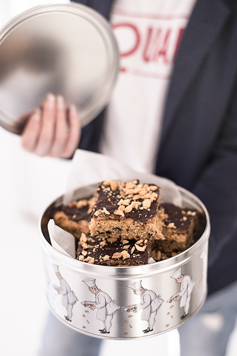 Pensla på chokladen över jordnötskolakrämen och skär kakan i rutor.
