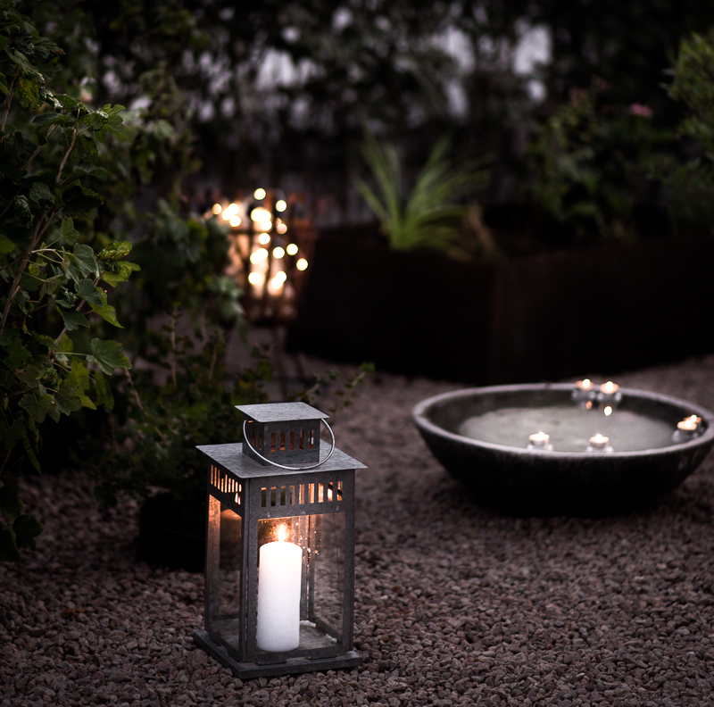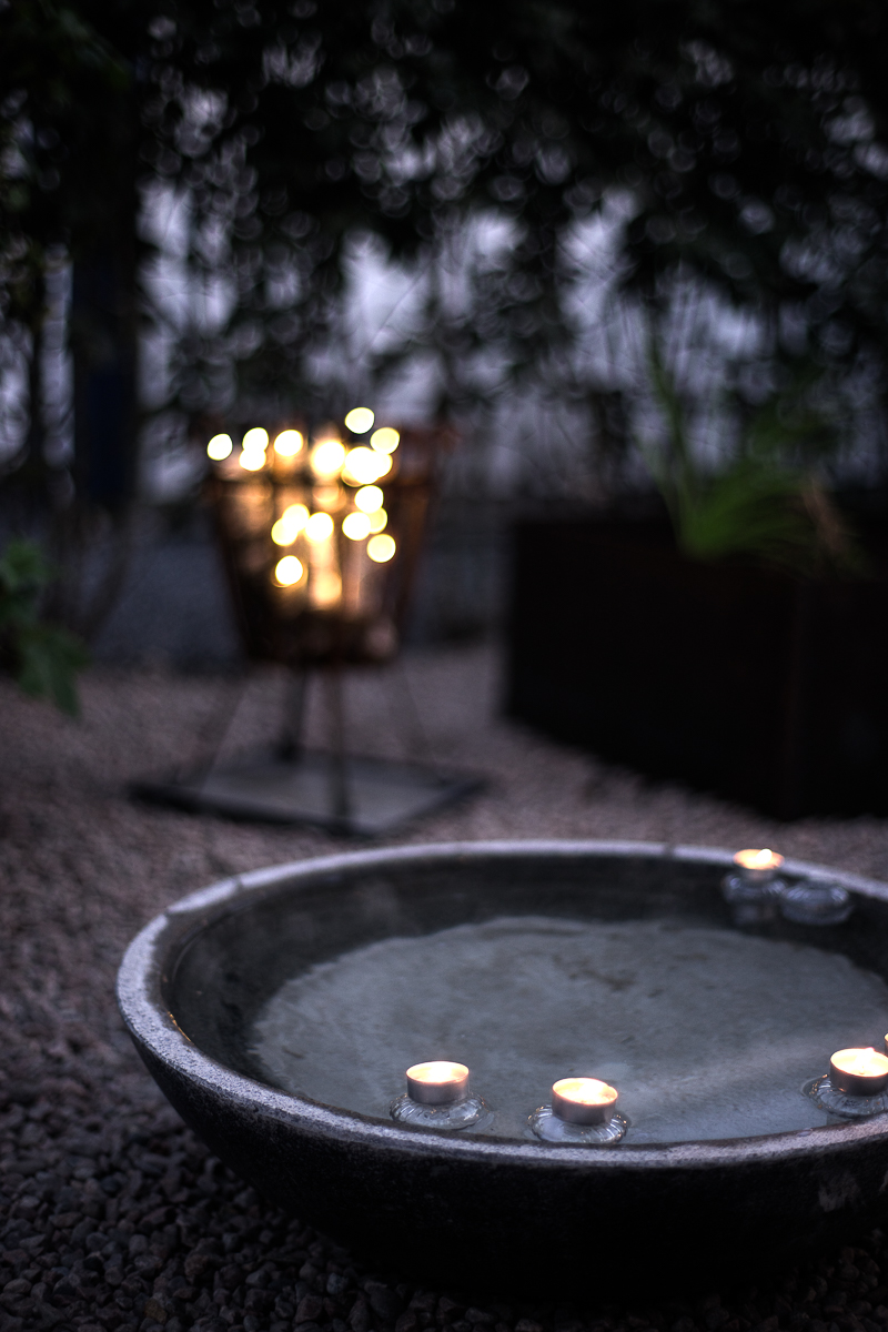 Och i fågelbadet simmar några ljus omkring, skapar en fridfull stämning.