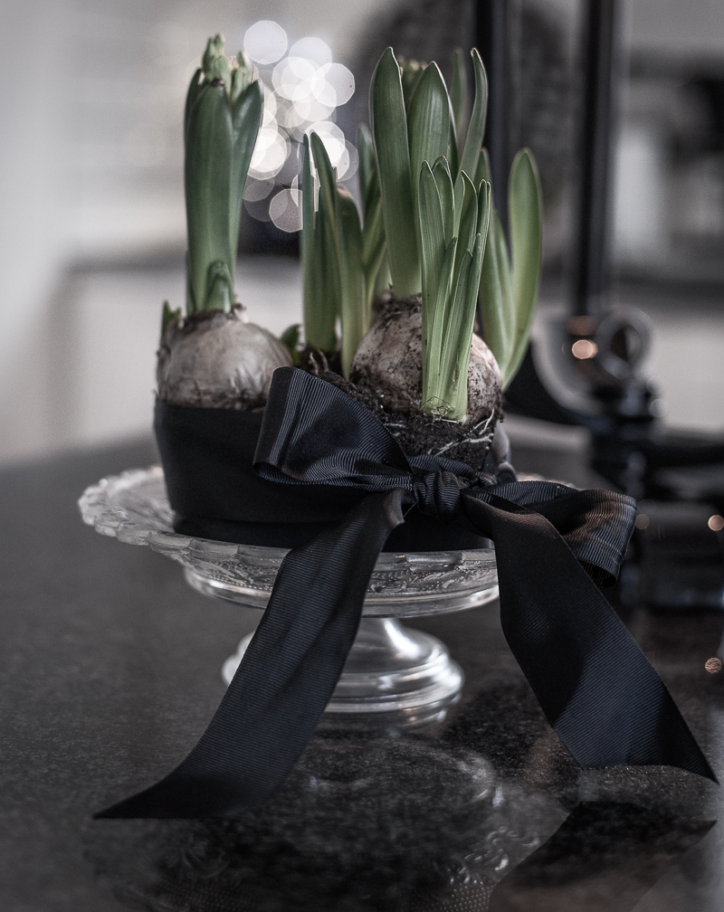 Jag tog ett kakfat på fot, satte hyacinterna utan plastkrukorna men med jorden kvar i en grupp och knöt ett sidenband om.