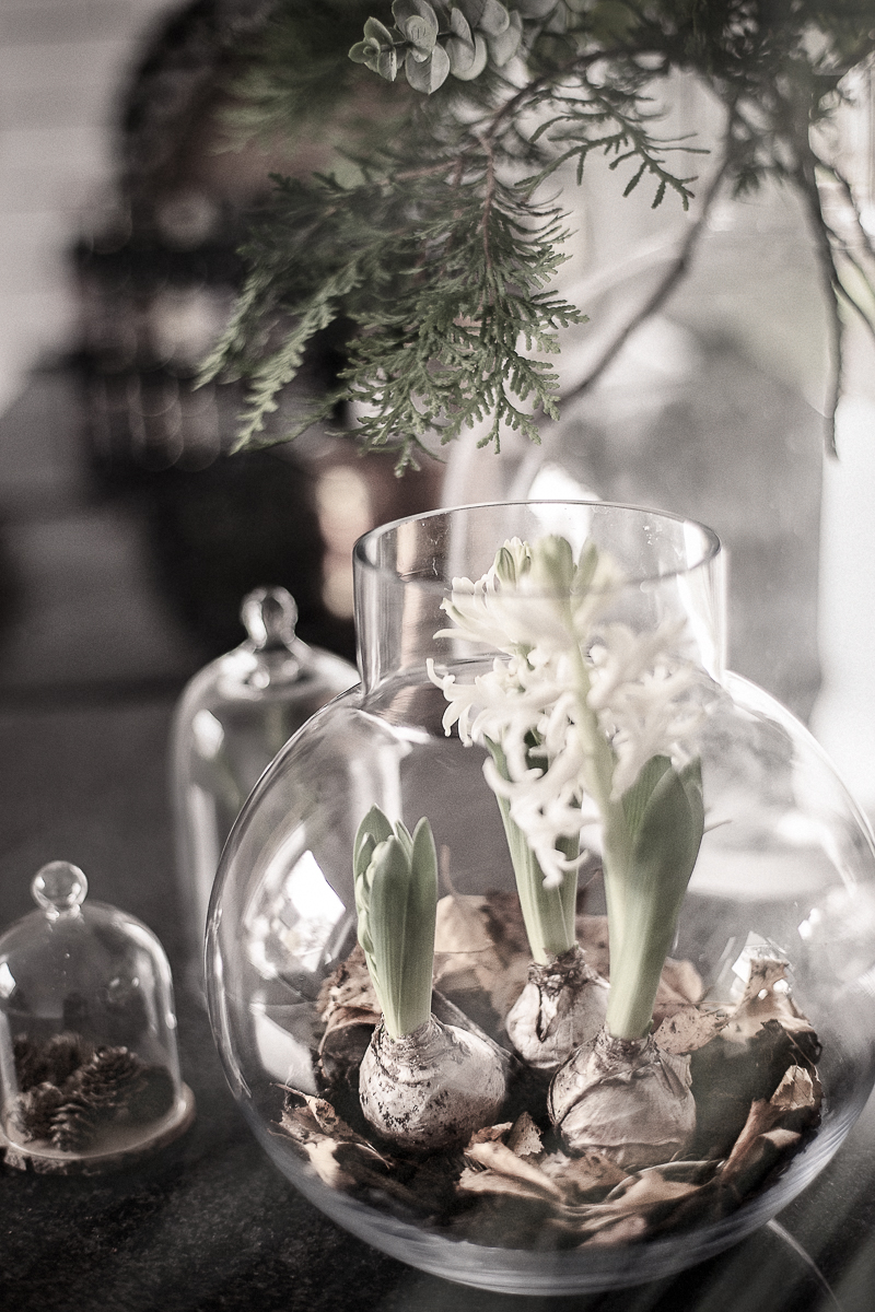 Och varför inte sätta hyacinter nere i en vas såhär med lite täckbark och löv, hur dekorativt som helst.