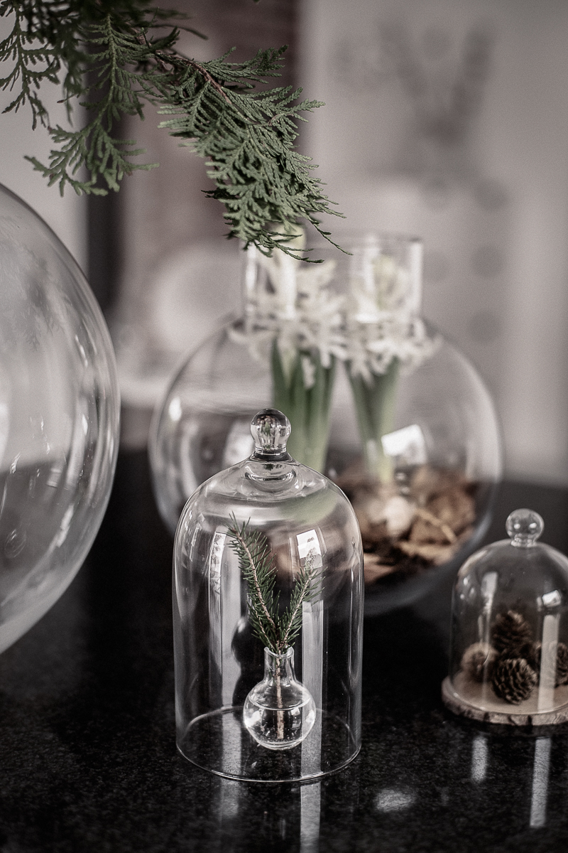 Att samla glasvaser och glaskupor såhär i en grupp och pynta med det naturen leverera ger en harmonisk julkänsla, vackert men inte överdådigt, sobert men ändå ombonat, helt enkelt den där julfeelingen jag vill åt.