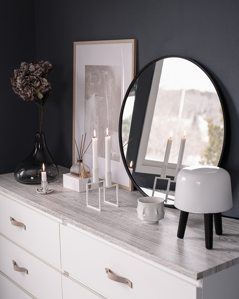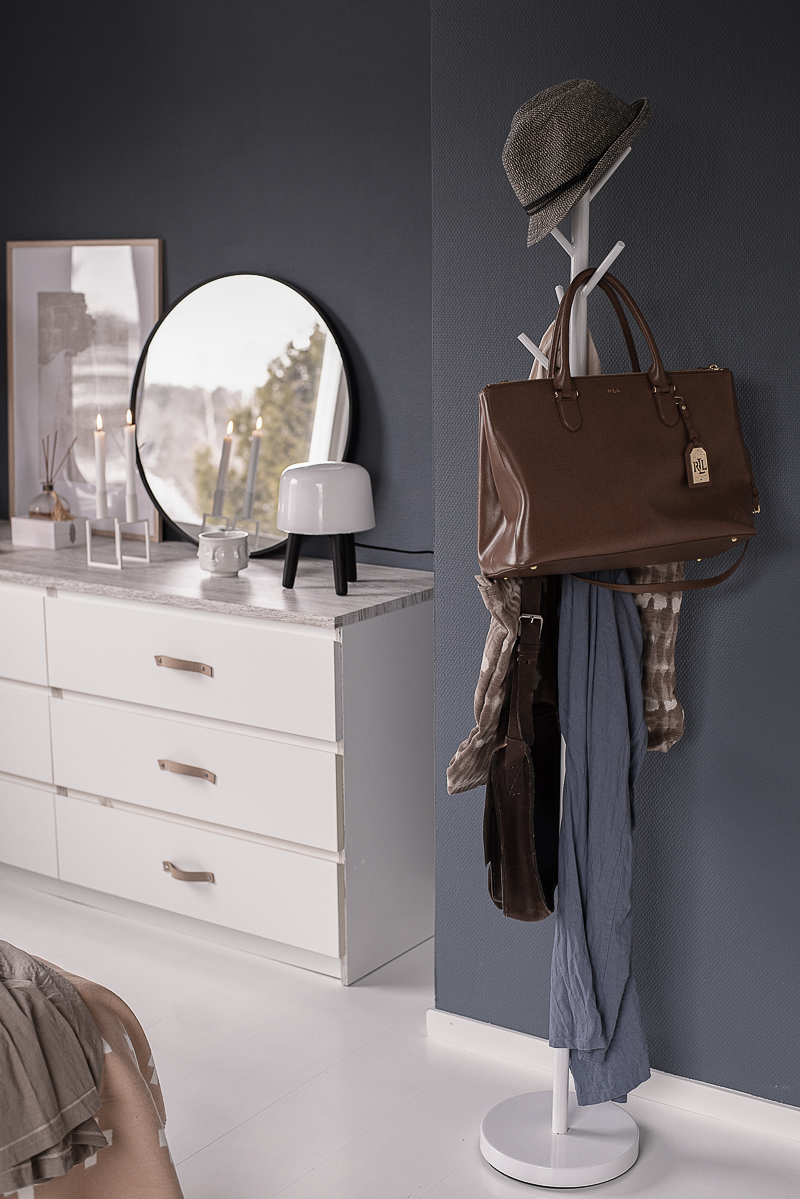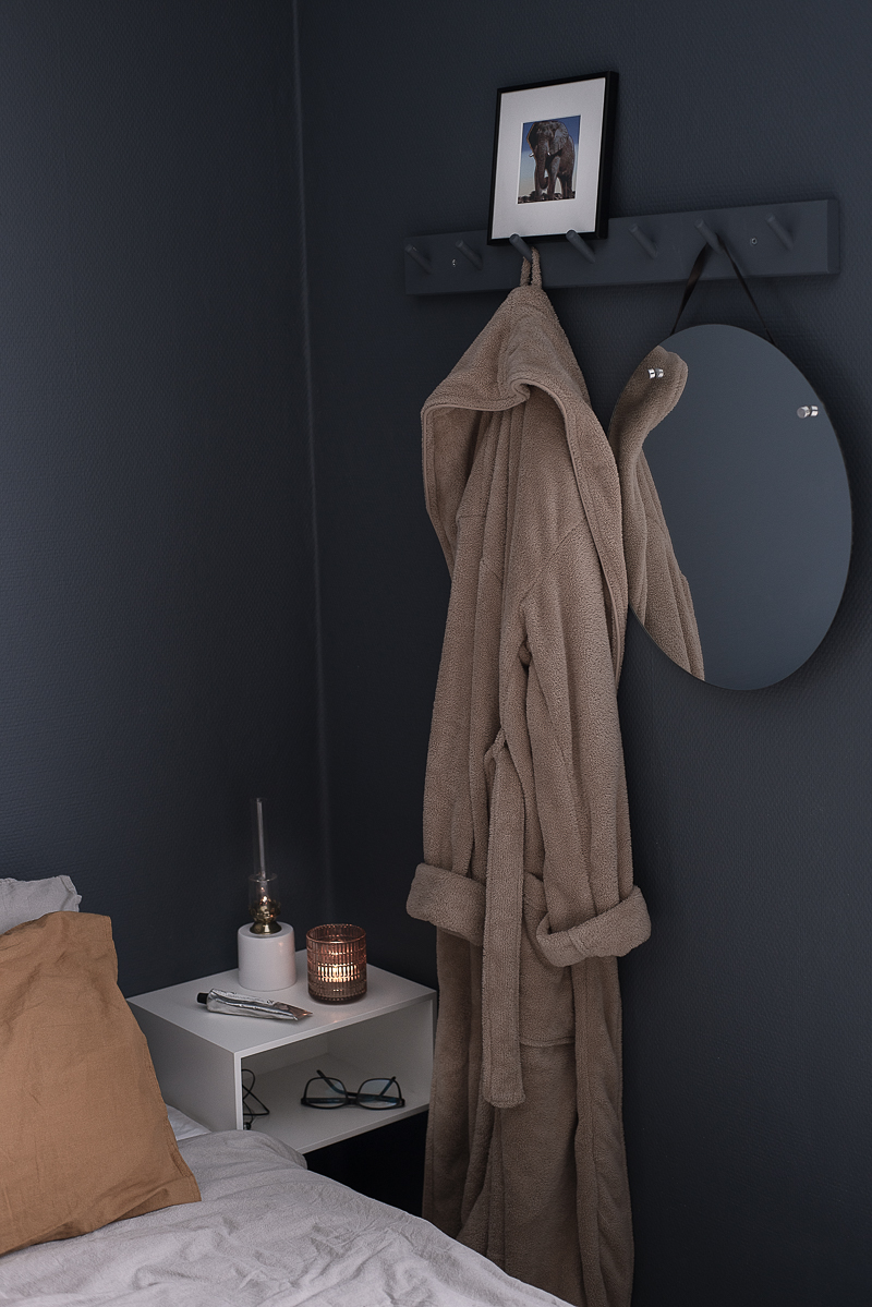 Vi målade om här inne förra året från en ljusgrå nyans till denna mörka blå, lite otippad färg när det gäller oss, men jag gillar den och jag inbillar mig att jag får ett mer lugn här inne när det inte är så ljust längre.