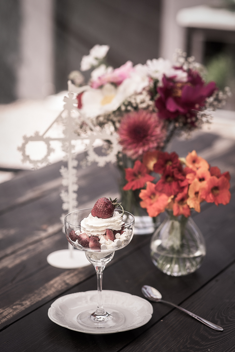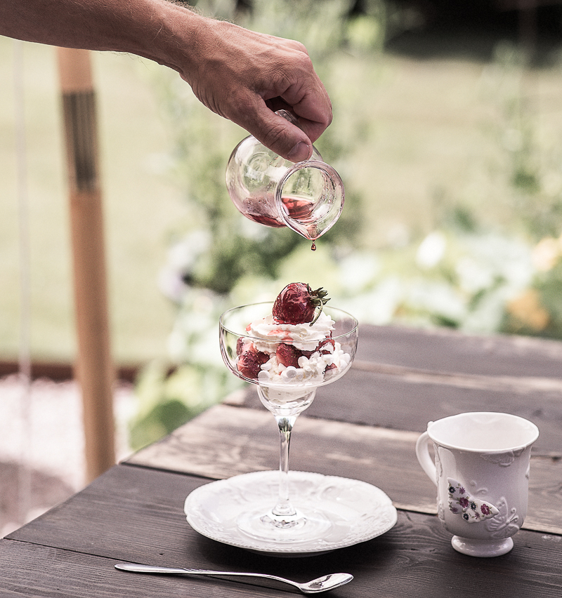 La krämen underst i glaset, sen skivade jordgubbar, strösslade fullt med små italienska maränger och sen kräm överst.