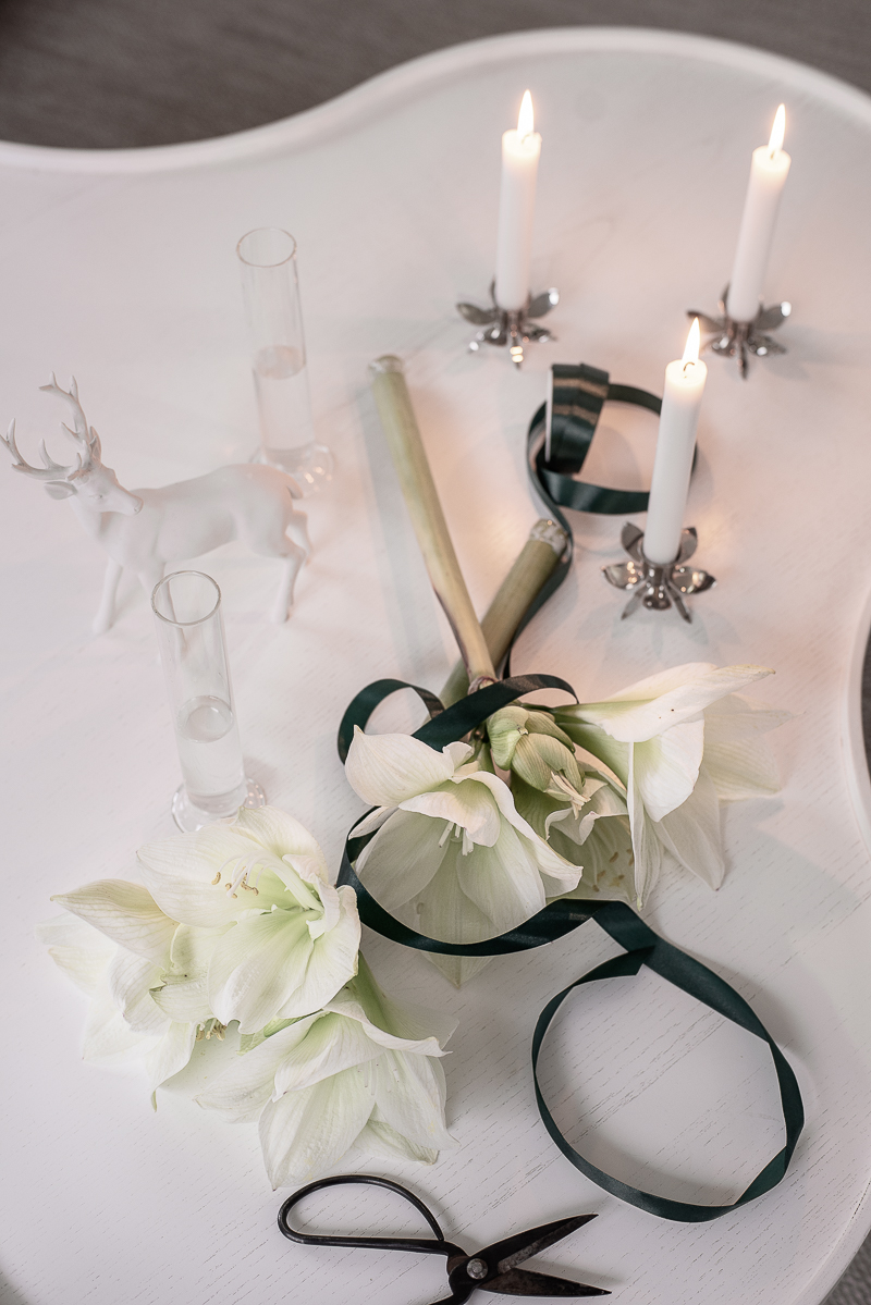 Här har jag valt att sätta amaryllisen i en rak, ganska hög vas så den inte tippar och för att göra det där lilla extra så sätter jag ett grönt sidenband runt.