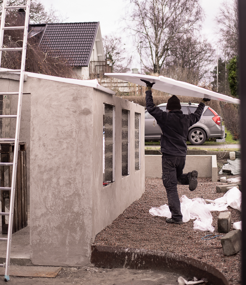 Med en hemmabyggd ställning och tungan rätt i mun så gick det plättlätt att få taket på plats.