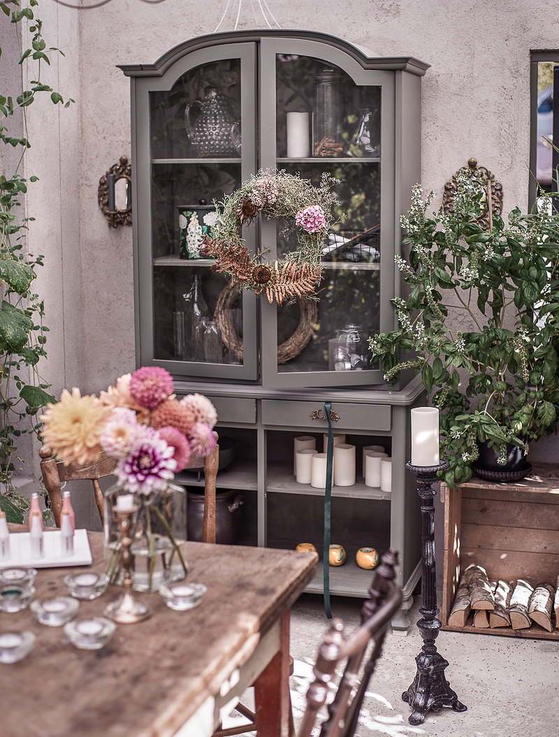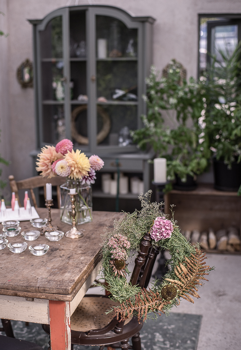 Hortensian är den ända “färska” blomman i kransen, ljuvlig kulör och kommer förhoppningsvis vissna med stil och behålla sin fägring.