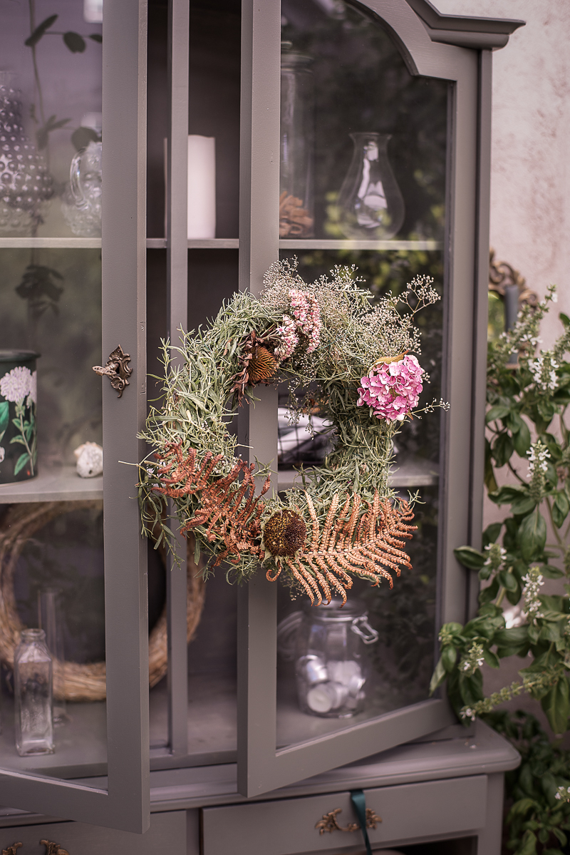 De något torkade ormbunksbladen lyser som bronsornament på kransen, absolut värda att ta hand om efter de levererat i årets rabatt.