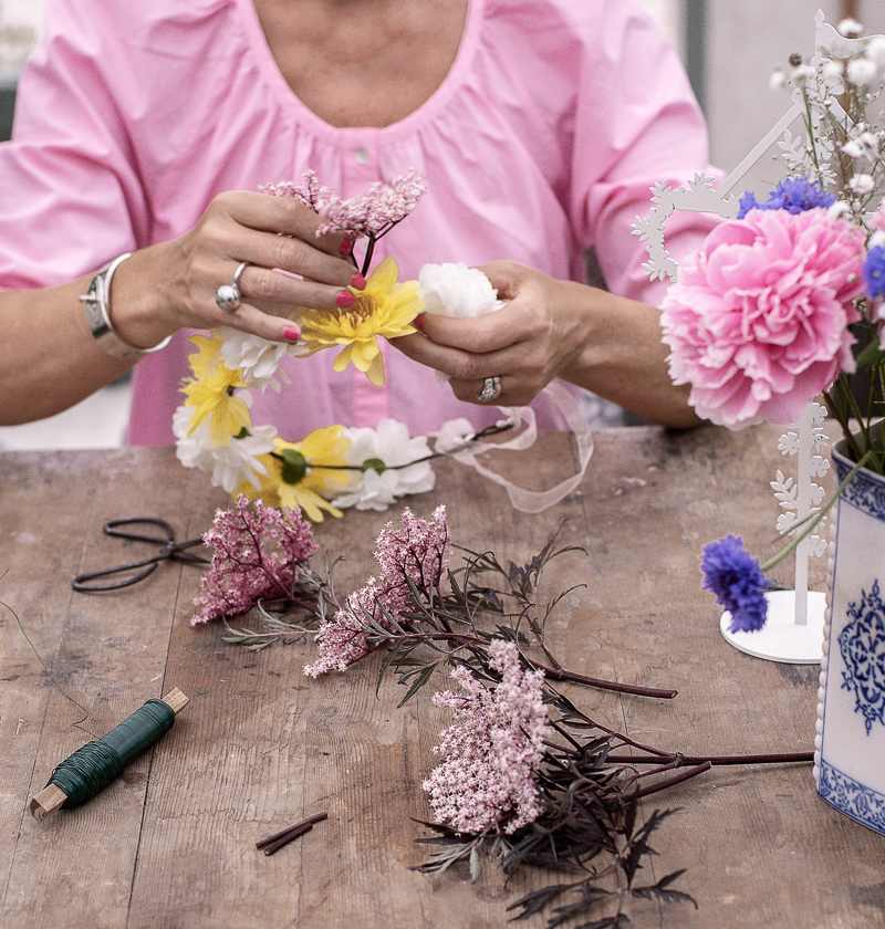 Man kan såklart använda vilka blommor som helst och vad som passar till den kransen man får tag på.
