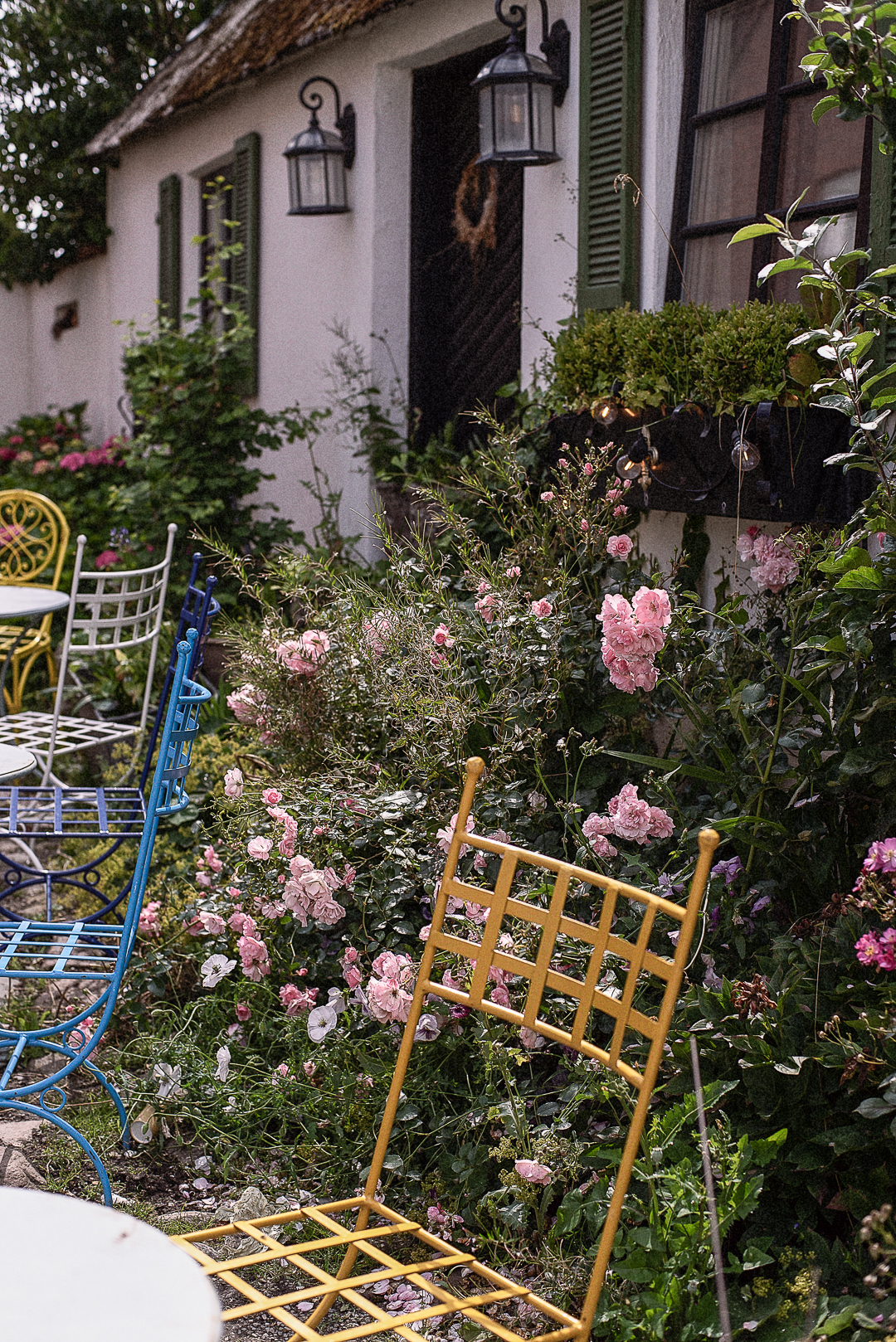 Sittplatser för den som ville slå sig ner och njuta av en kopp kaffe och dofta på rosorna.