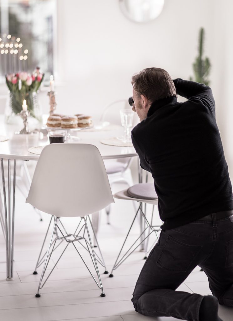 Mellanmål samtidigt som jag fick den helt grandiosa buketten i vatten, en väldoftande rosa lilja, färgade videkvistar och en ny sort av eukalyptus som jag aldrig sett tidigare.